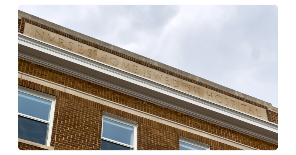 Look closely at the very top of Kyle Garden Square, just above the entrance, and you'll find it carved into the stone: Nurses' Home Swedish Hospital. It's easy to miss, but for those paying attention, it tells the story of this building.